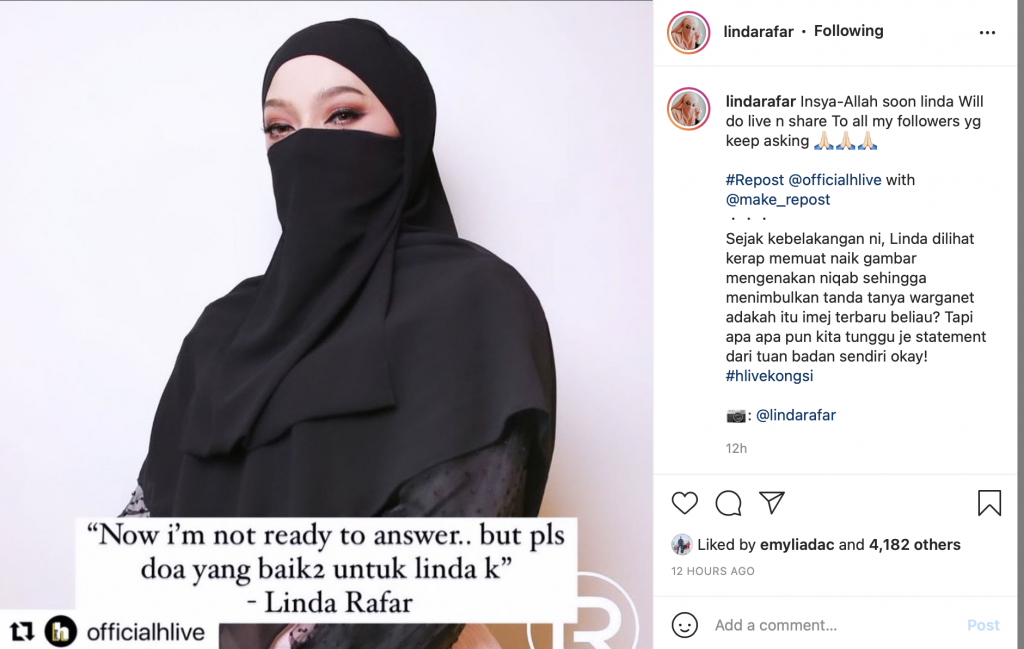 Sebelum ini, penampilan Linda menjadi tanda tanya ramai pihak apabila sering memuatnaik gambar dirinya yang berniqab di akaun media sosial.