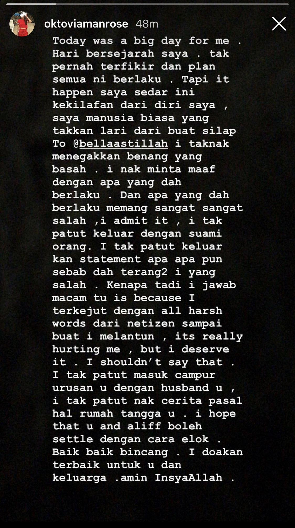 Menerusi status di Insta Story, Octovia memberitahu bawah segala yang berlaku itu adalah kekhilafan daripada dirinya dan tidak pernah menjangka perkara sebegitu berlaku.