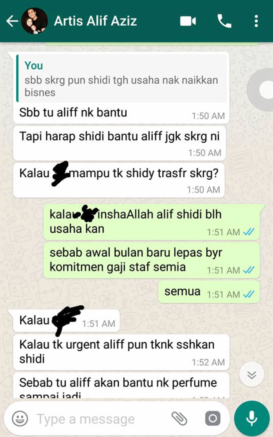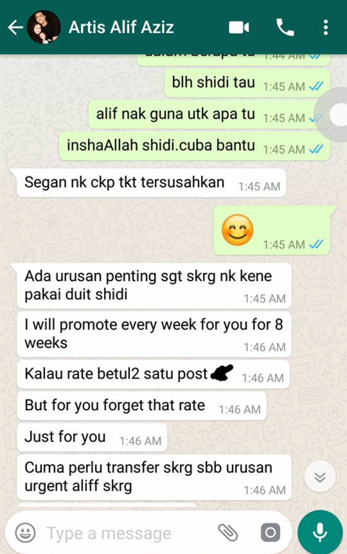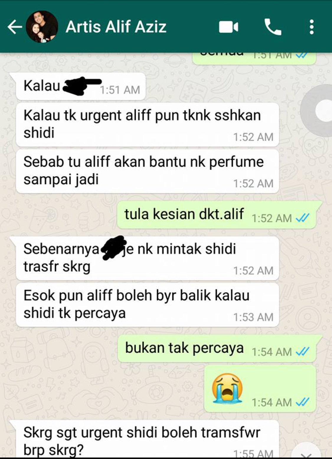 “Padahal dia call saya banyak kali untuk pinjam duit. Lepas saya tak layan dia cuba taktik lain dengan buat tawaran promote produk saya NK EXCLUSIVE PARFUM sampai jadi hingga 8 minggu. Walaupun saya cuba menolak menolak banyak kali dia tetap ganggu saya call dan whats’s app.