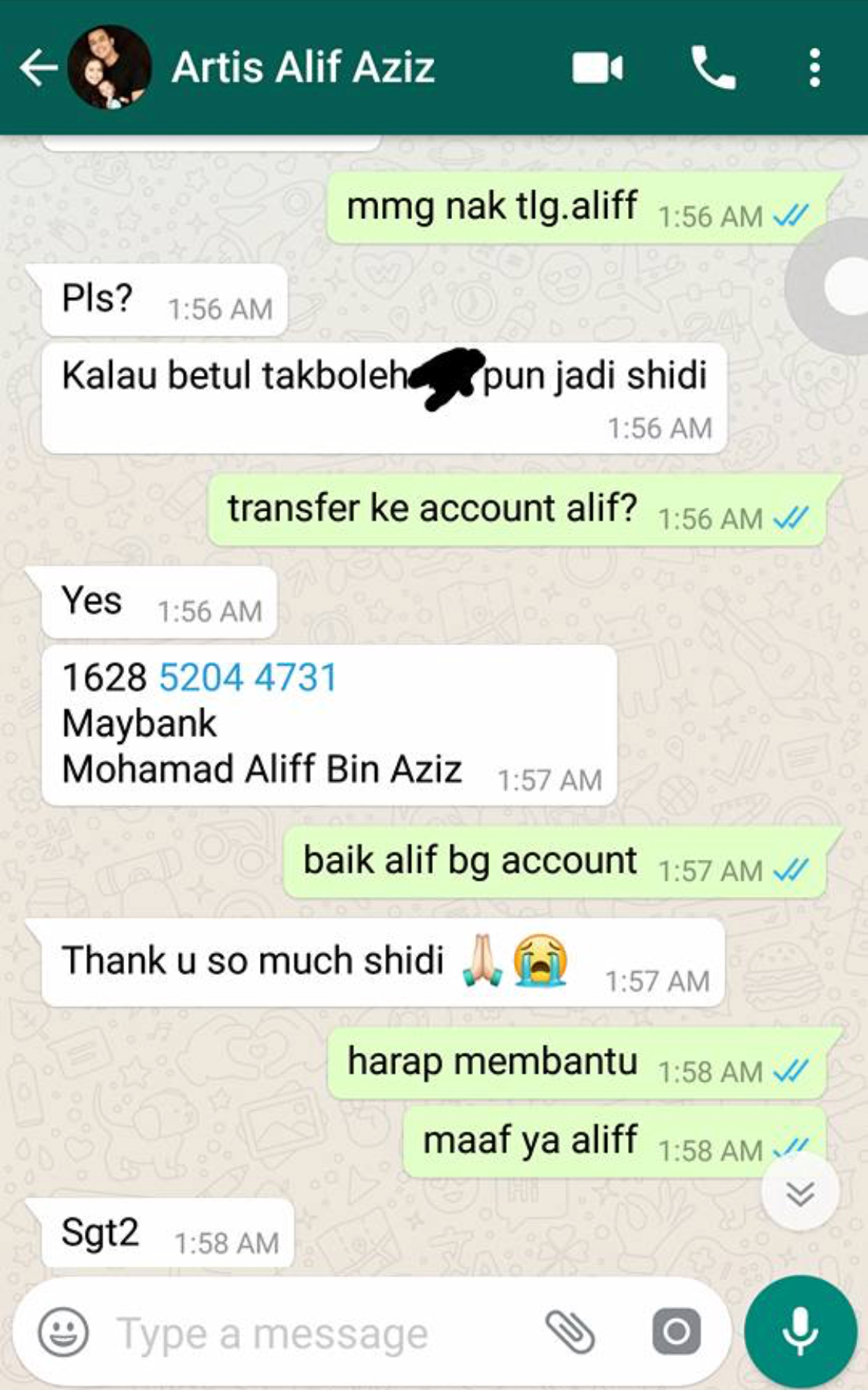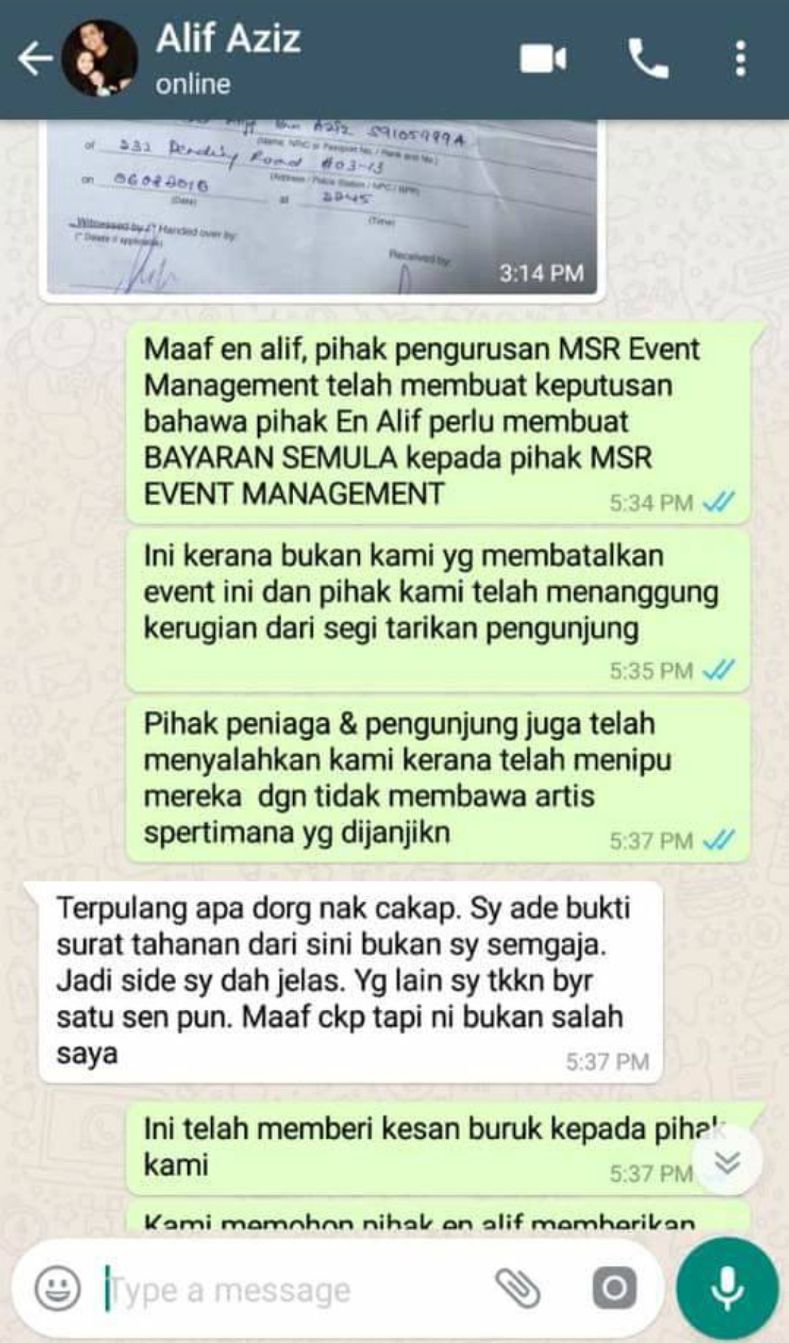 “Rakan saya telah beri duit deposit dan akhirnya dia tak hadir event itu dan rakan telah menanggung rugi dan turut dimarahi vendor kerana cuba menipu kerana artis yang dijanjikan tak muncul walhal Aliff Aziz cancel last minit dan tidak ingin melakukan refund walaupun satu sen.