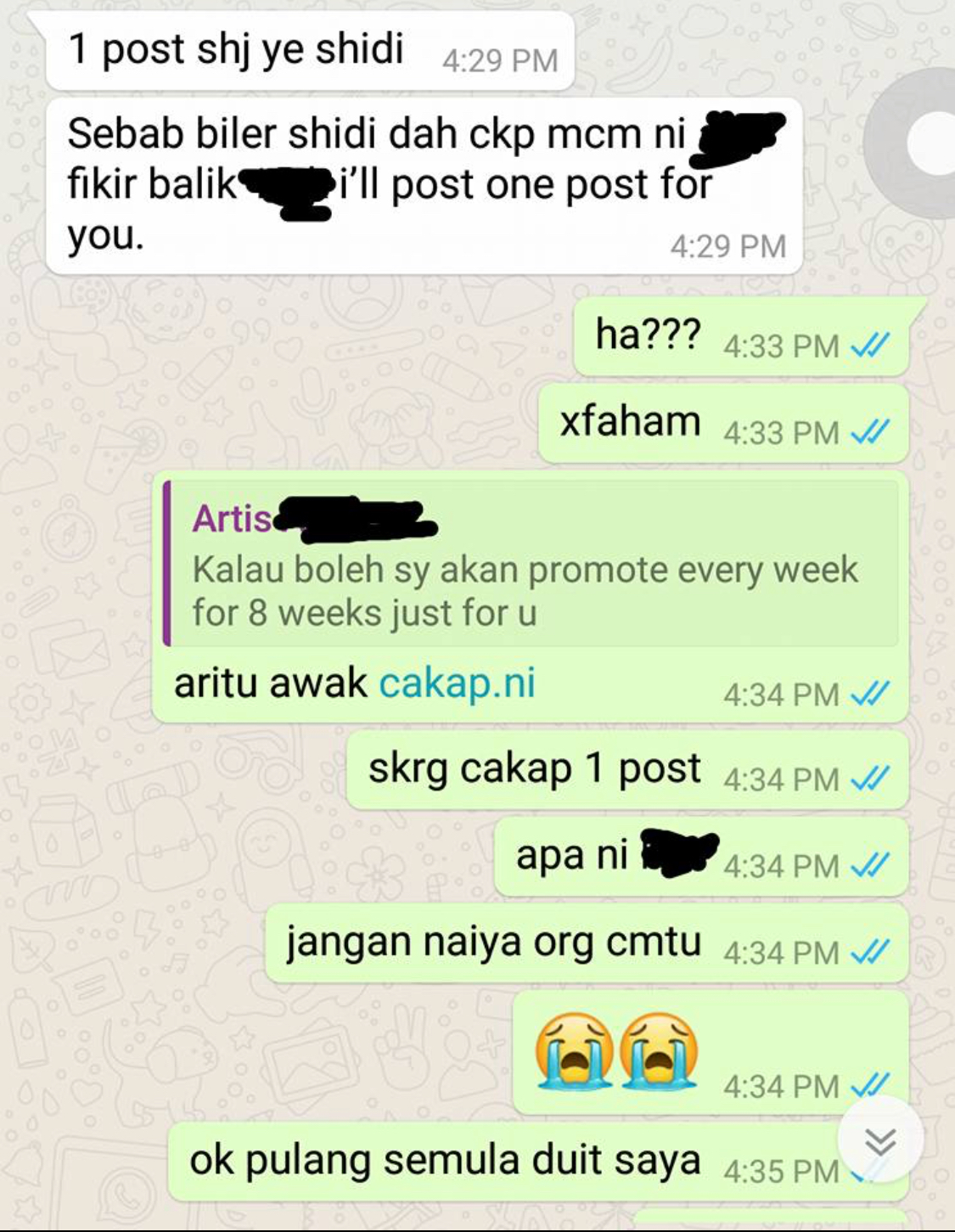 Menurutnya, selepas dia berkeras enggan untuk memberikannya duit lagi, pelakon berkenaan menyatakan dirinya hanya akan post sekali sahaja, sedangkan sebelum itu berjanji untuk promosi selama lapan minggu.