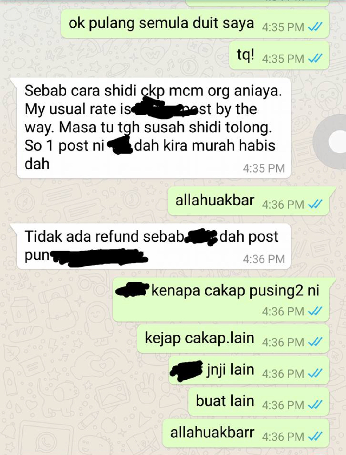 Menurutya, cubaan untuk meminta semula duit dan buat report telah diugut oleh pelakon itu kerana dia dikatakan ada peguam sendiri. – KopiPlanet.com