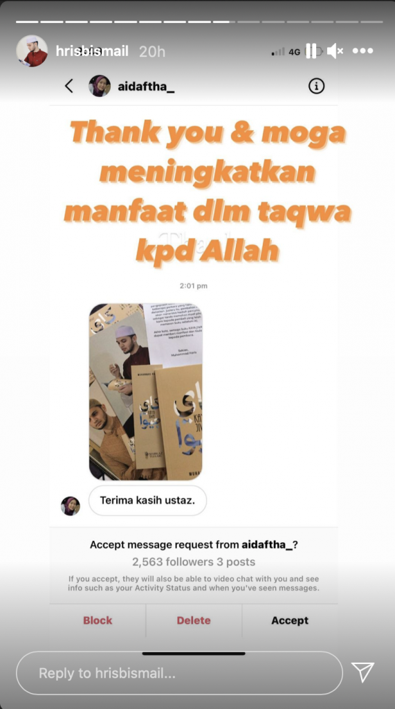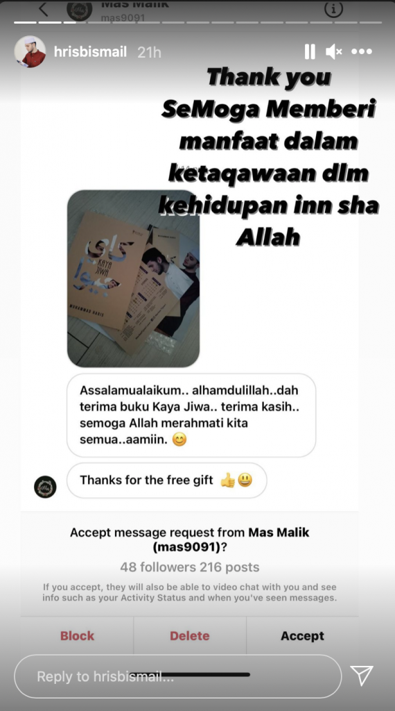 “Thank you & moga meningkatkan manfaar dalam taqwa kepada Allah,” tulisnya yang membalas Insta Story peminat yang telah membeli bukunya itu.