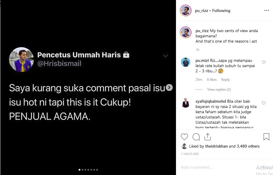 “Saya kurang suka comment pasal isu-isu hot ni tapi this is Cukup! PENJUAL AGAMA. Semalam ada one of production people call saya and the ask ‘ustaz, berapa ribu ustaz letak harga kalau nak jemput datang tempat/tv saya?’