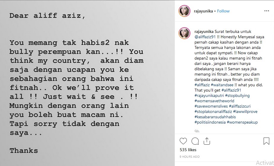 “Surat terbuka untuk @aliffaziz91!!! Honestly menyesal saya pernah cakap kasihan dengan anda!! Ternyata semua hanya lakonan anda untuk dapat simpati.