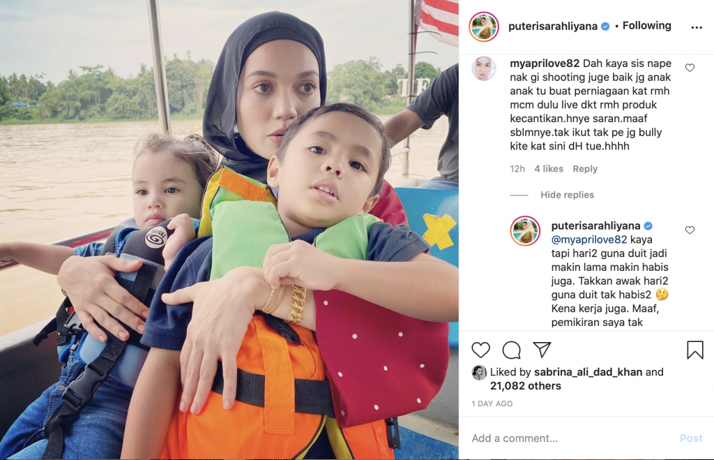 Selain itu, Puteri Sarah juga membidas seorang lagi netizen yang mempertikaikan dirinya kembali berlakon dan mengatakan dia seorang yang kaya.