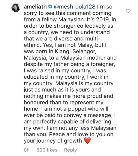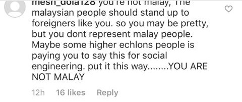 “Saya sangat sedih komen ini datang daripada orang Malaysia sendiri. Sudah 2019, sepatutnya setiap daripada kita tahu negara kita terdiri daripada kepelbagaian kaum dan etnik yang duduk di bawah satu bumbung. Ya, saya bukan orang Melayu tapi saya dilahirkan di Klang, Selangor oleh ibu saya yang merupakan warganegara Malaysia.
