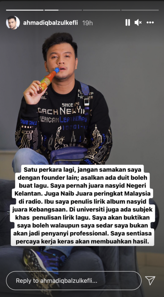 “Satu perkara lagi, mangan samakan saya dengan founder lain, asalkan ada duit boleh buat lagu.