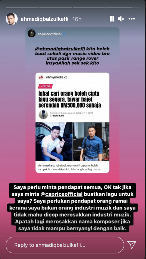 Menerusi perkongsian di Instagram, Iqbal menyatakan tentang sejarahnya yang pernah muncul juara dan naib juara pertandingan nasyid.