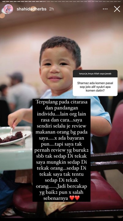 Isteri kepada usahawan selebriti Datuk Seri Aliff Syukri iaitu Datin Seri Nur Shahida Mohd Rashid mengulas tentang komen yang diberikan Sharnaaz Ahmad terhadap Sup Jolo yang dijual suaminya.