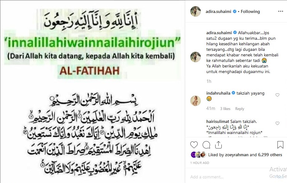 Menerusi Instagram miliknya, isteri kepada Datuk Red itu memberitahu bahawa neneknya pula telah meninggal dunia pada hari ini.