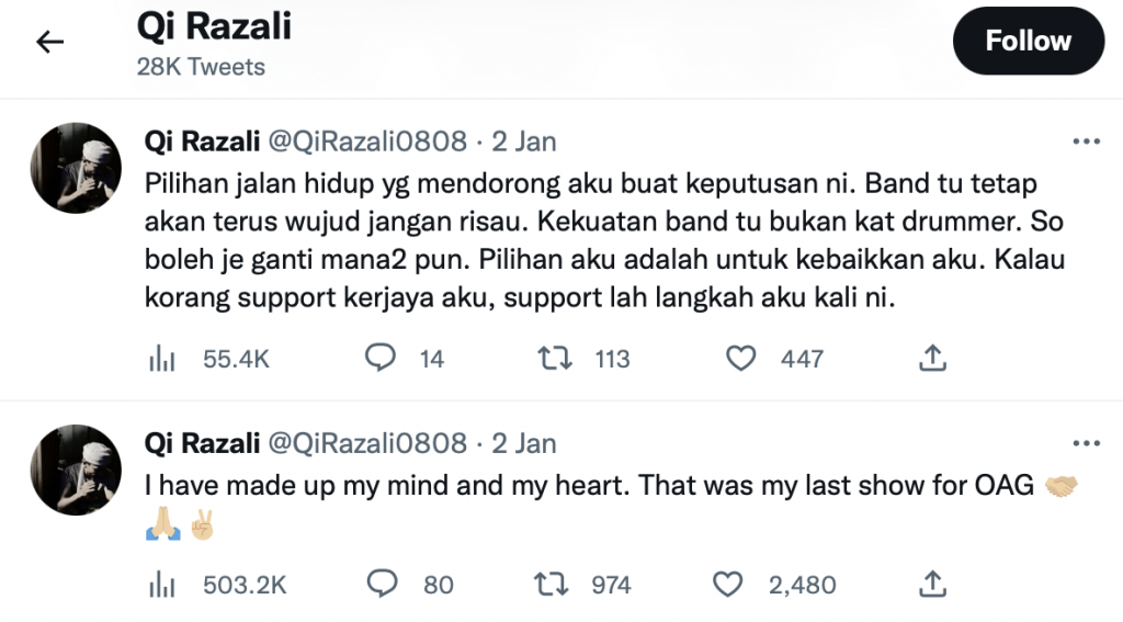 Perkara berkenaan diumumkan sendiri oleh Qi menerusi akaun Twitter miliknya dengan memaklumkan aksinya pada pada konsert berkenaan adalah yang terakhir bersama OAG.