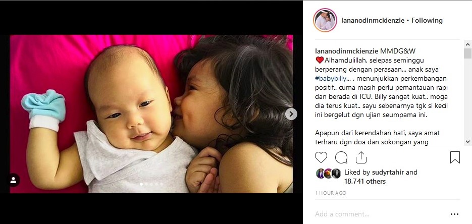 Lana menerusi laman Instagramnya memberitahu, biarpun menunjukkan perkembangan positif, anak keduanya William Daud McKienzie itu masih lagi dalam pemantauan rapi.