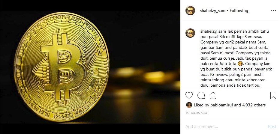 “Tak pernah ambik tahu pun pasal Bitcoin!!! Tapi Sam rasa, company yang curi-curi pakai nama Sam, gambar Sam and pandai2 buat cerita pasal Sam ni mesti Company yg takda duit.