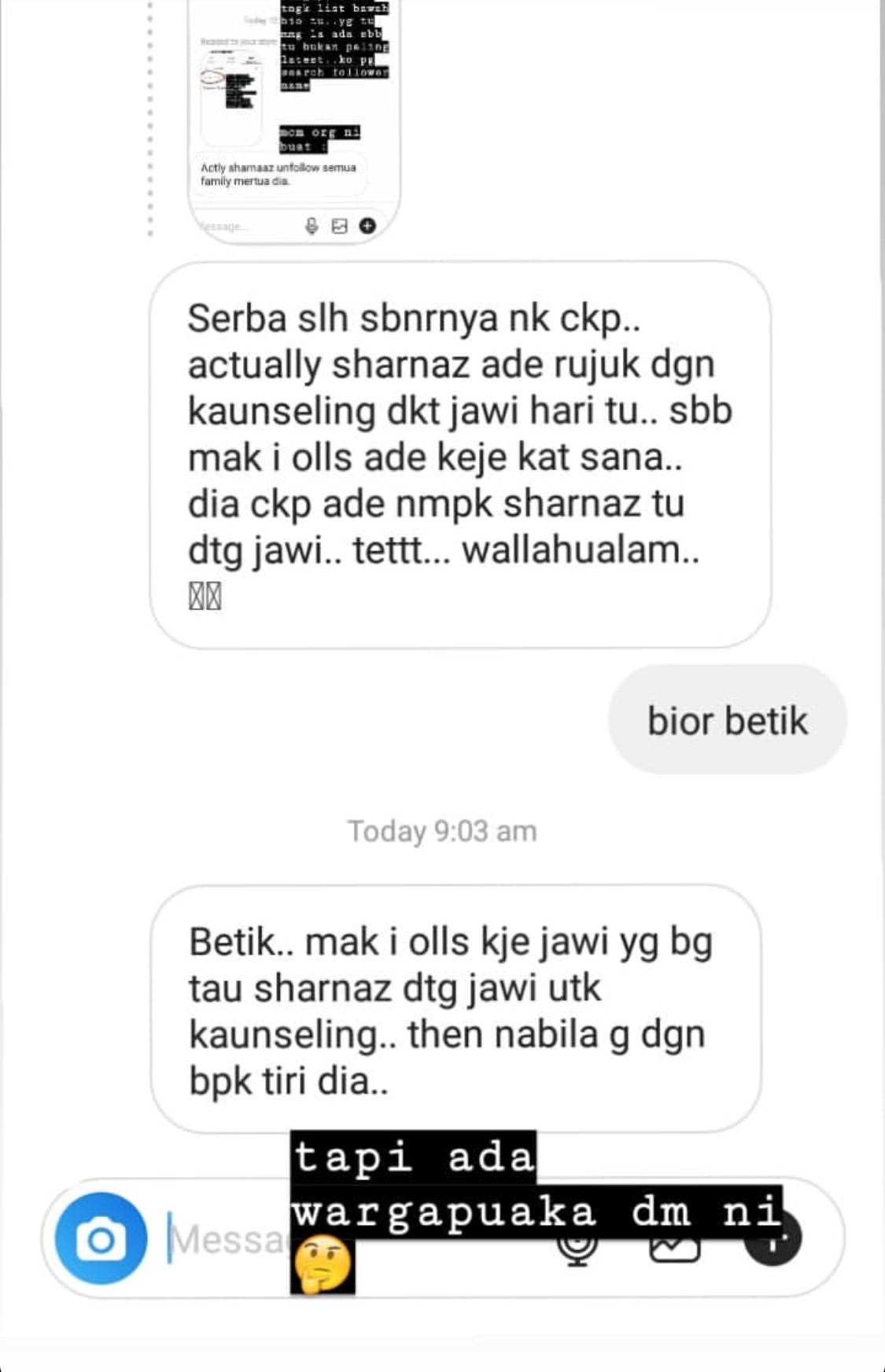 “Serba salah sebenarnya nak cakap… Actually Sharnaaz ada rujuk dengan kaunseling dekat JAWI hari tu… Sebab mak iolls ada keje kat sana… Dia cakap ada nampak Sharnaaz tu datang JAWI… tettt… wallahualam…