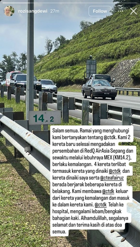 “Empat kereta terlibat termasuk kereta yang dinaiki Ectdk dan kereta dinaiki saya serta @cteafairuz berada berjarak beberapa kereta di belakang,” kongsinya.