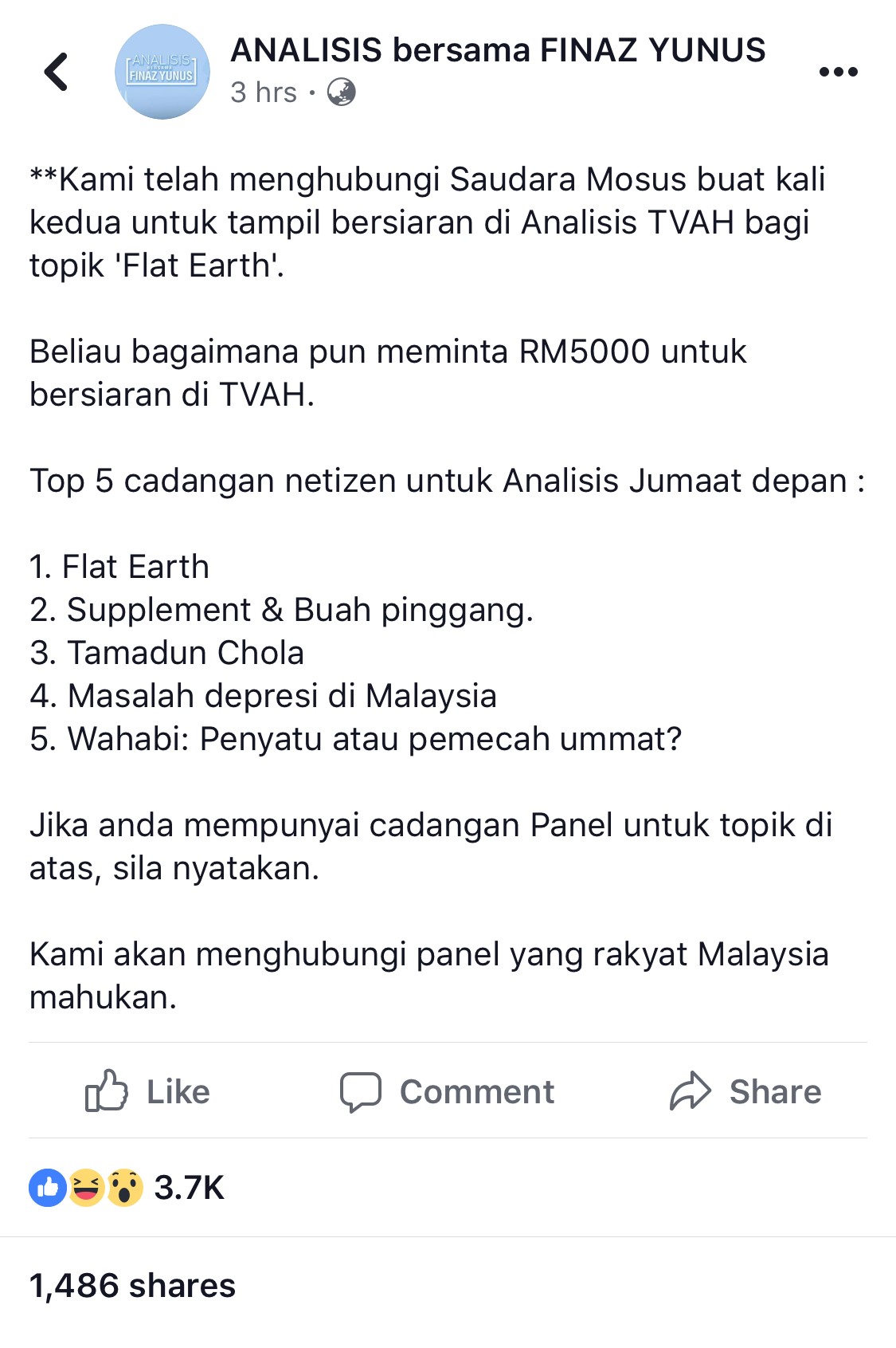 “Kami telah menghubungi Saudara Mosus buat kali kedua untuk tampil bersiaran di Analisis TVAH bagi topik ‘Flat Earth.