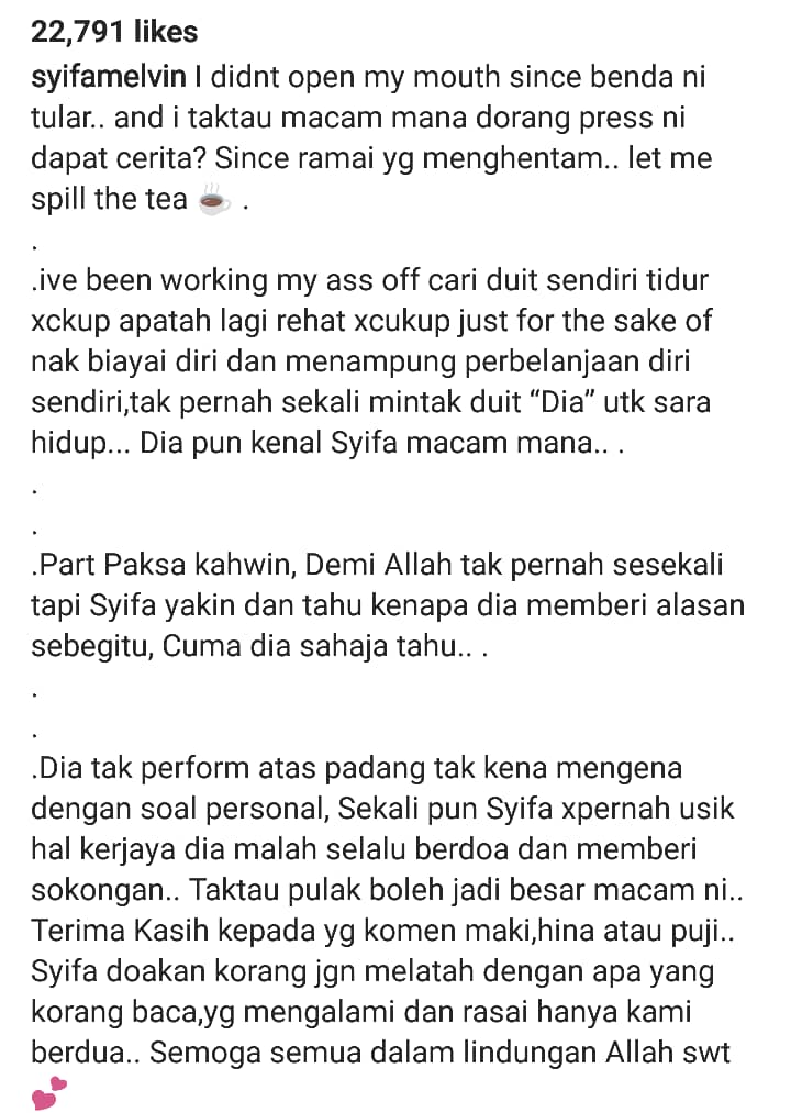 “Saya doakan korang jangan melatah dengan apa yang korang baca, yang mengalami dan rasai hanya kami berdua. Semoga semua dalam lindungan Allah SWT,” tulisnya di laman Instagram peribadi miliknya.