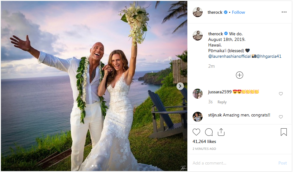 Menerusi gambar yang dikongsi di laman Instagram miliknya, The Rock dan Lauren dilihat berbusana serba putih dan kelihatan cukup gembira.