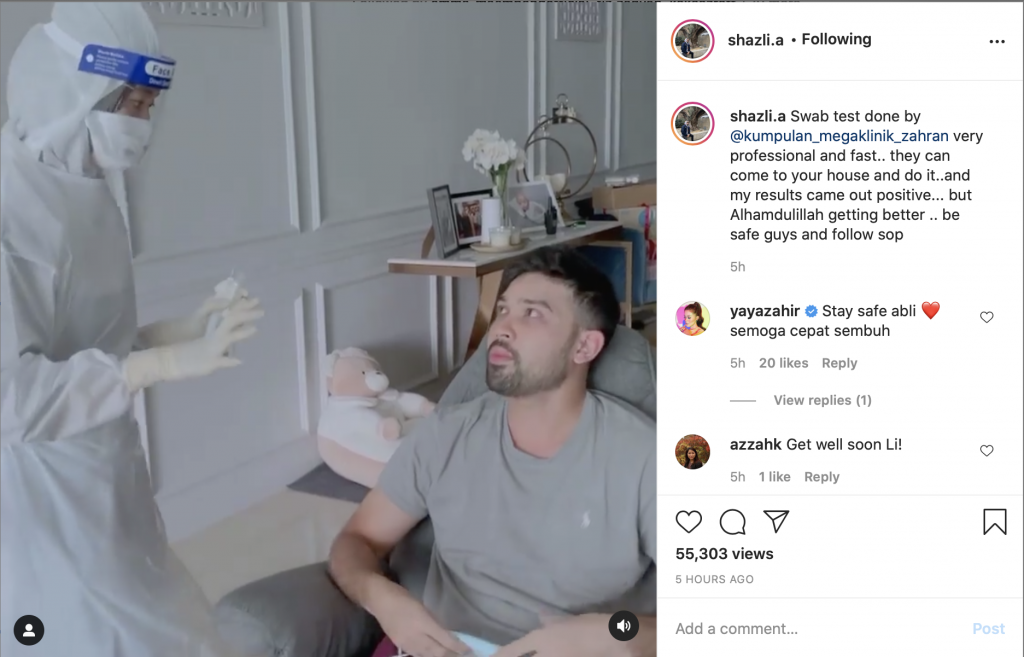 “Melakukan ujian swab di rumah dengan @kumpulan_megaklinik_zahran. Terima kasih banyak kerana datang dan terima kasih @kai_armd @nafidzrazak kerana memberikan maklumat yang kami perlukan.