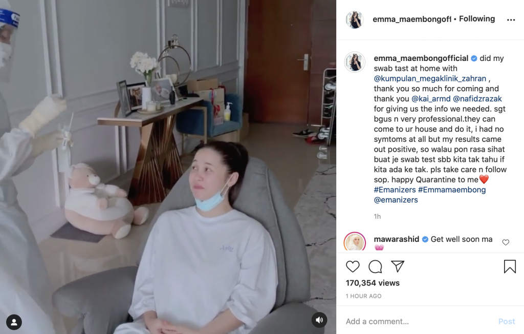 Perkara berkenaan dikongsikan sendiri oleh Emma yang telah membuat ujian swab di rumahnya.