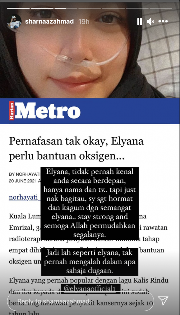 “Elyana, tidak pernah kenal anda secara berdepan, hanya nama dan tv. Tapi just nak bagitau, saya sangat hormat dan kagum dengan semangat Elyana.