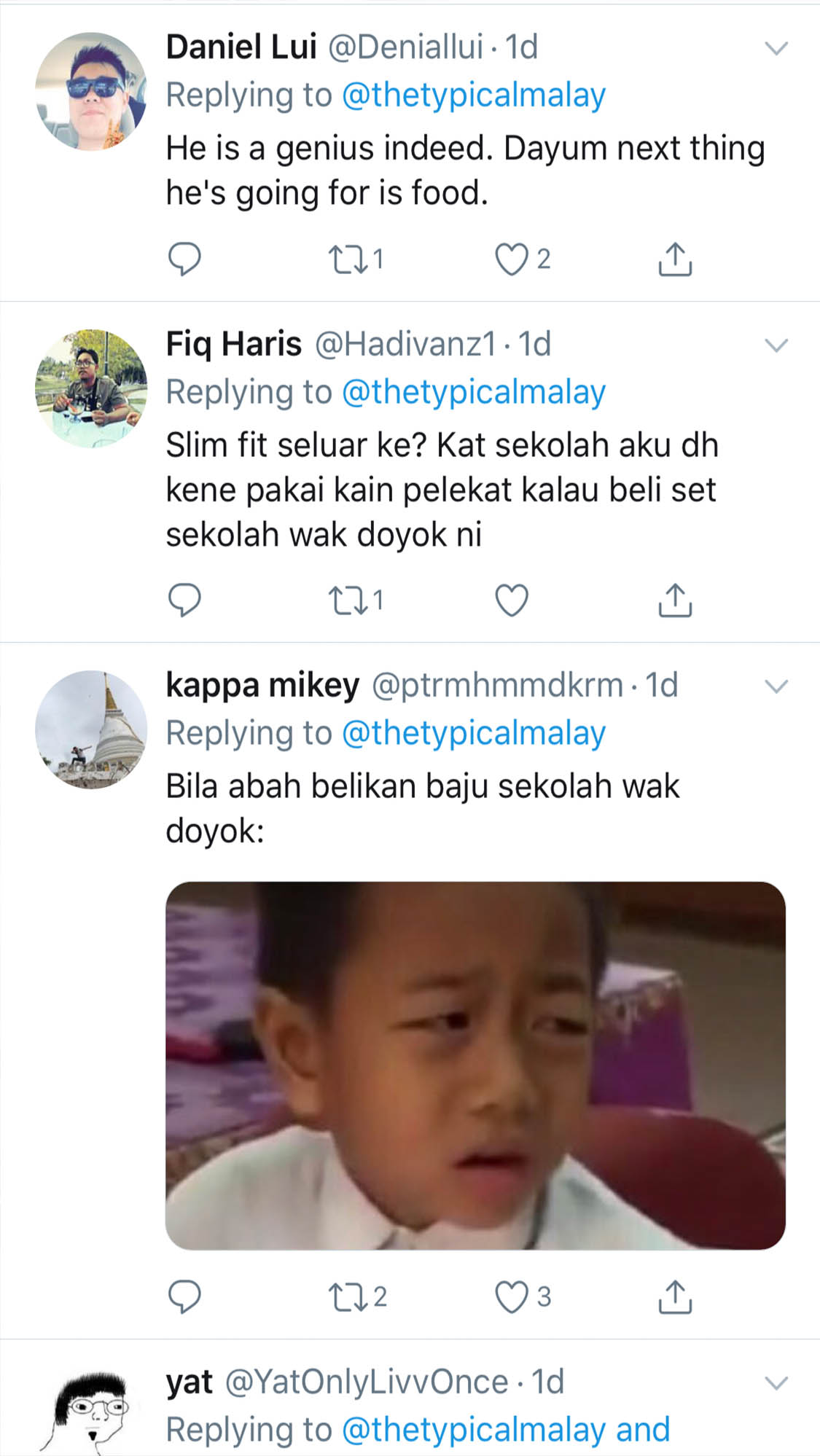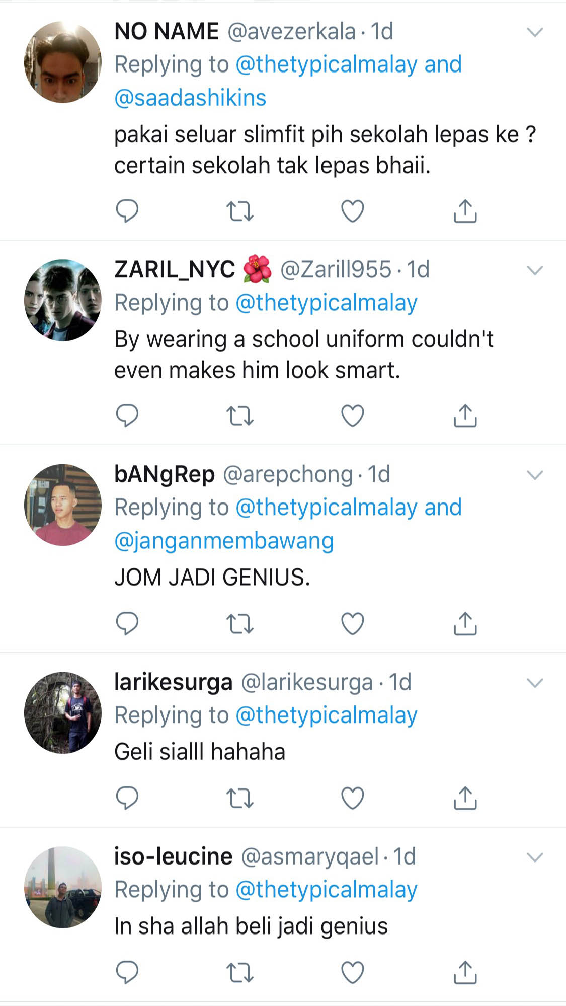 “Pakai seluar slimfit pih sekolah lepas ke? Certain sekolah tak lepas bhaii,” ujar seorang pengguna laman Twitter yang menggunakan nama @avezerkala.