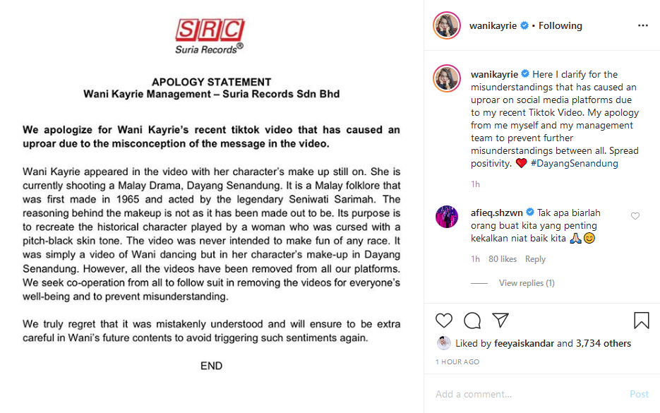 Gara-gara memuat naik video TikTok yang menampilkan dirinya berwajah hitam membuatkan penyanyi Wani Kayrie dikecam segelintir netizen.