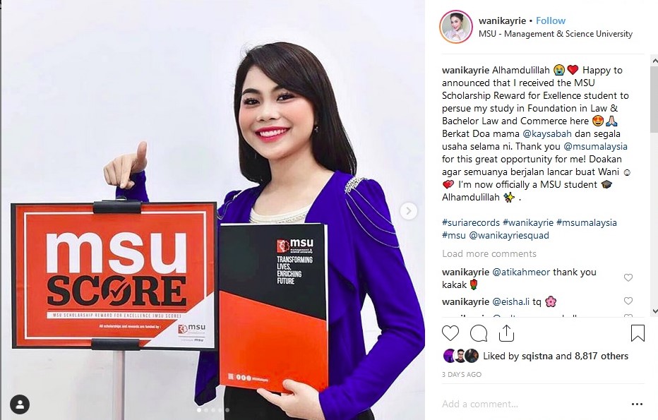 Dalam pada itu, penyanyi itu juga meluahkan rasa syukurnya apabila mendapat biasiswa sepenuhnya oleh pihak universiti berkenaan sepanjang pengajian menerusi MSU Scholarship Reward for Exellence Student.
