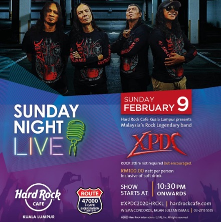 Kumpulan lagenda XPDC bukan satu nama asing dalam industri hiburan tanah air. Setelah hampir 31 tahun ditubuhkan, XPDC yang dianggotai Mael, Zuar, Amy dan Jeff bakal mengegarkan pentas Sunday Night Live (SNL) di Hard Rock Cafe, Kuala Lumpur pada 9 Februari ini, jam 10.30 malam.