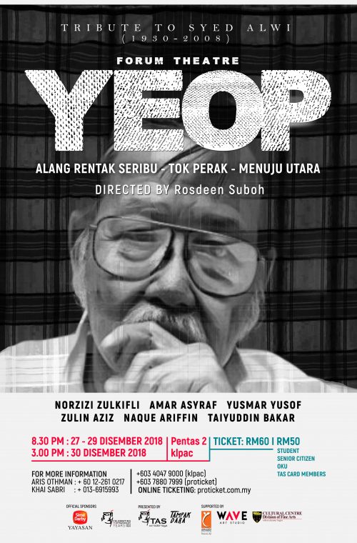 Satu projek teater berjudul Yeop: Tribute To Syed Alwi bakal diadakan bermula 27 hingga 30 Disember ini di Pentas 2, Kuala Lumpur Performing Arts Centre (KL Pac).