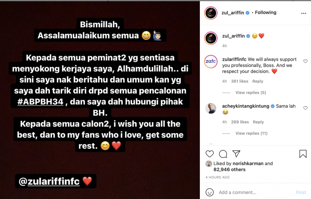 “Di sini saya nak beritahu dan umunkan yang saya dah tarik diri daripada semua pencalonan #ABPBH34, dan saya dah hubungi pihak BH. Kepada semua calon-calon, I wish you all the best,” ujarnya.